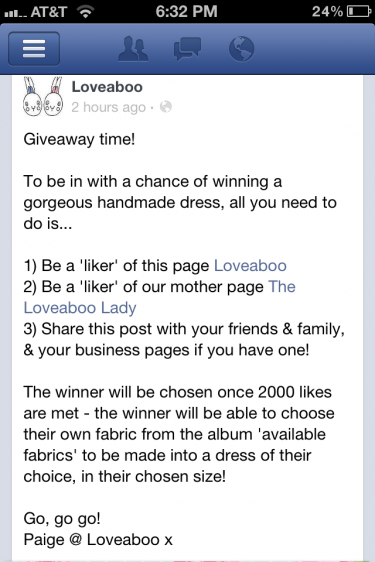 02/08/2013 18:25As many of you know Instagram (IG) is an app that smart phones users can utilize. I myself just got this app about 4 months ago & I I happen to really like it; besides being able to edit your photos in a somewhat professional manner for FREE you can actually find hundreds a vendors via the community of IG. One of those vendors happened to be a lovely woman, Paige Gillard, who sews and makes beautiful dresses, shorts, pajamas etc... THE WHOLE 9 including shoes, bed sets and so much more. Aside from the absolutely adorable prints and fabrics she uses, the prices are reasonable so I believe your getting a great deal especially since so many of the items are one of a kind! There's nothing better than original piece for your little princess to wear is there not? I didn't think so! haha Anywho you can add this lovely lady on facebook by liking her page, LOVEABOO (capital letters aren't necessary) and from there you can see all of the fabrics she has available and once you've chosen that just shoot her an email and she'll take it from there. I look forward to getting a dress from her that I absolutely have to have among a few other fabrics I have my eye on. She is also currently holding a giveaway on her facebook page, I'll provide the details below in a photo alongside some other photos of items that she has created! Enjoy everyone! -X0X0X0 CIA0, Jaylin!